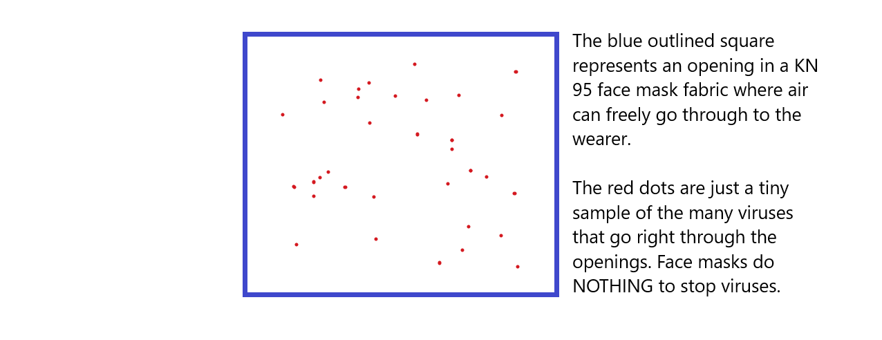 dangerous unicorns.round virus smaller than large square hole in fabric breath diapers on the face work as good as asking a unicorn to pull a plowWhy are people being told to wear these innefective devices by man date? On eBay they show face masks for sale KN95 "PM2.5" which means Particulate Matter size of 2.5 micrometers. They CAN stop cement dust YOU CAN SEE and fly ash YOU CAN SEE from a fire and pollen and mold spores but that is not how they are being sold to the public in this fake health emergency. They can also stop you from breathing in some dust mites but not viruses and some bacteria maybe but viruses are wayyy too small, they go right through the fabric holes. They can't stop smog, tobacco smoke, or soot or atmospheric dust. For that matter in the last massive virus panic of the 1980's Margaret Heckler who was the Health and Human Services Secretary in the USA told people that wearing condoms to 'protect from viruses' was like leaving your front door open and expecting flies not to come in. Even condoms do not stop viruses. Who keeps telling us they do? People are being brainwashed to believe that viruses are thrown out of other people's breath and they can "catch them" without being able to also let go of them. This is mostly emenating from disingenuous sellers of various products like vaccines and treatments and testing methodologies that do not even find virus. The tests for 'covid' do not find virus. Even the very inventor of the technology Kerry Mullis long ago stated that the PCR method cannot possibly determine exact viruses they find fragments of other particulates that are in everyone every day of their lives which viewing these proves nothing. Kerry also pointed out the problems with the claims of HIV being cause of AIDS when there was and still is no scientific proof of this only claims. What is going on here? We are in the middle of the same kind of panic that happened in the 1980's where a virus was blamed for multi-caused diseases. Explaining how panics cause scientific misjudgements gets a bit complicated so for now let's stick with looking at our face masks in the mirror and the size of viruses and how the fabric mesh does nothing to protect us. Take a look at this example I created of the size of holes that let oxygen through a face mask fabric mesh. Think of panty hose where you can see through the MESH, face masks also have a mesh with holes so you can breathe in oxygen and viruses GO RIGHT THROUGH. ![]() Viruses are even smaller than smog, tobacco smoke (or vaping fog), and soot, most certainly smaller than heavy dust. Viruses go right through according to this chart by Jisaac9, Mieszko the first. There are tens of thousands of other references that verify this. ![]() Face masks don't stop smog or suspended atmospheric dust or soot or gaseous contaminants like the horrible fumes now coming from the putrid smelling disinfectants which are all GASEOUS CONTAMINANTS (look at the diagram again). If you can breathe through a mask you are breathing in viruses. Viruses are not the problem. All public spaces are suddenly now required to use 'hospital grade disinfectants' to "kill the virus" which is not something that can be killed as viruses are not living things. These have a horrible smell that makes me wonder what chemicals are being used, are they chemical waste from industry being reprocessed like fluoride? I am much more concerned about these aerosols and their effects on our health, look at what they are doing to our Earth. We really have to ask what is going on here? We are in the middle or hopefully very close to the end of a 'public health crisis' and governing DISASTER while we are being gassed with gaseous contaminants over something the body handles naturally with it's own immune system's antibodies no matter what virus enters ever. If you are healthy you body works to do this naturally. We don't need synthetics provided by 'vaccines' anymore than we need synthetic vegetables or meat made of nylon. Face masks are pacifiers. It's time we all grow up and stop being treated like children - end this maskcharade. IT HAS NO SCIENTIFIC BASIS Take a look at how face masks cannot even stop tear gas where both protesters and police were incapacitated by the fumes there was smoke everywhere and it stopped people in their trax and they coughed and puked as their lungs knew that it was being bombarded with particles that went right through and around the sides of these fake protection devices that medical and political cons everywhere keep promting will 'keep us safe' It was interesting to recently November 30, 2020 see Mariposa County health authorities present a graphic to show people the varying levels of protection that different mask wearing or not wearing scenarios would allegedly provide regarding alleged viruses never isolated to prove their esistence in this case of recent hysterias and lockdown insanity. I decided that since they did not provide any actual figures I should use science just like these virologists do in guessing what these levels ARE LIKELY TO BE. If anyone has exact science to prove any other assertions please feel free to let me know. ![]() Let's look at the highest risk number in the chart above with no masks at all the 'risk' is .0005%. That is a 5 in 1,000,000 chance we could 'catch the virus' even though we can throw it away just as easily let's just stay in our fear zone and believe that it's only caught. That comes out to a 1 in a 200,000 chance of 'getting it' in public. Would you apply for a job knowing you have those odds? 1 in 200,000 is a 99.999% rate of never ever 'catching' it, that's with NO MASKING, NO DISTANCING, NO STUPIDITY in changing the way we have always lived. Now let's say you 'caught it' with those odds while doing the dangerous task of living your life without masks that let viruses go right through anyway, you then also have a 99.8% chance of fully recovering, so that makes the chance of ever getting dead from