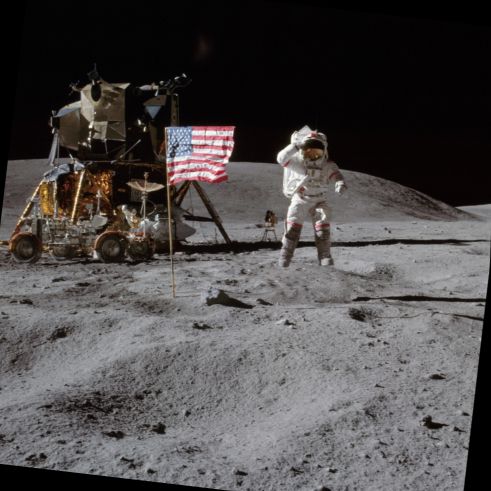 NASA image not photograph of movie set thea tricks showing astro not jumping in 1/6th gravity. I adjusted the angle to level as it was off 6.66 degrees. Those are real numbers provided by this fake space corporation that sucks billions of tax payer cash. Notice the shadow of the flag pole is off in 2 pieces. His chest in this image higher than the first cross pole and as high as the upside down umbrella. Notice the curve down ward of the reflection of cough cough the moon in his helmet proving once and for a few the moon is flat and round. Actually since he is jumping the angle is wrong he should reflect on this that the moon should be a straight line. Millions will instead of thinking this through will just trust the science and continue with this retarded display of a moon rover and a space ship that make no sense. It's a heap. If you think this model heap went to the moon LOL that is hilarious.