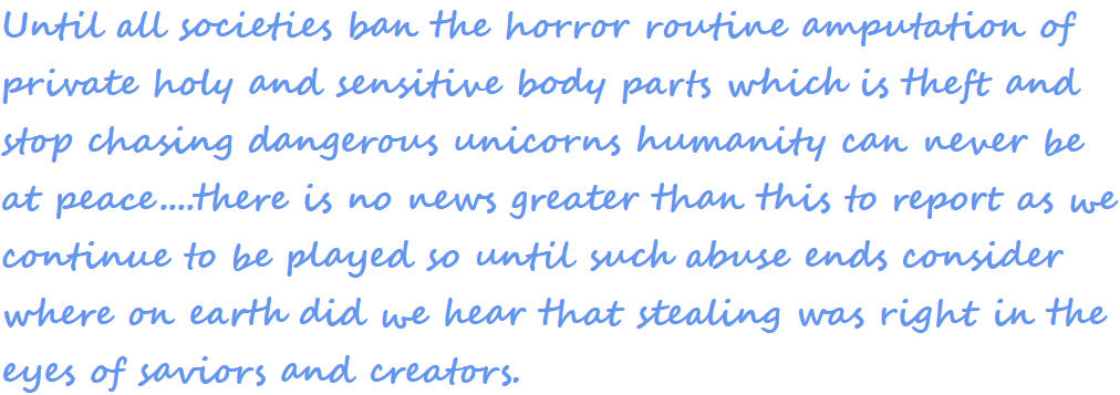 Foreskin 1st America Second Until every human being is protected from the horrific slicing off of skin on the most private of parts we wonder what the hell kind of country do we have if we do not make protecting baby male bodies from the horror of slicing off ROUTINE SKIN. Baby men do not know how to say NO at that new age. Medical system happily uses it in many experiments and such as well as billing biling billing making these systems RICH RICH RICH. Then when they need more boats and private jets and new cas tles they turn on the newest scam like we saw in 2020 hindsight. Ban that theft of skin.