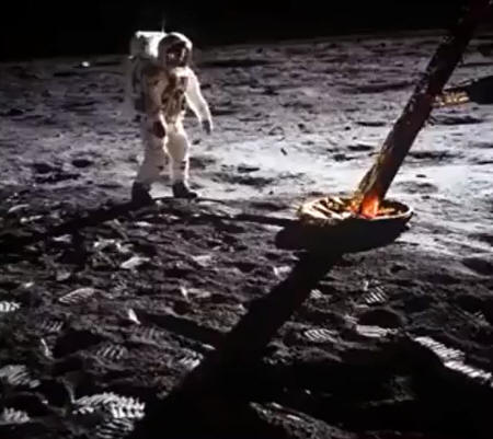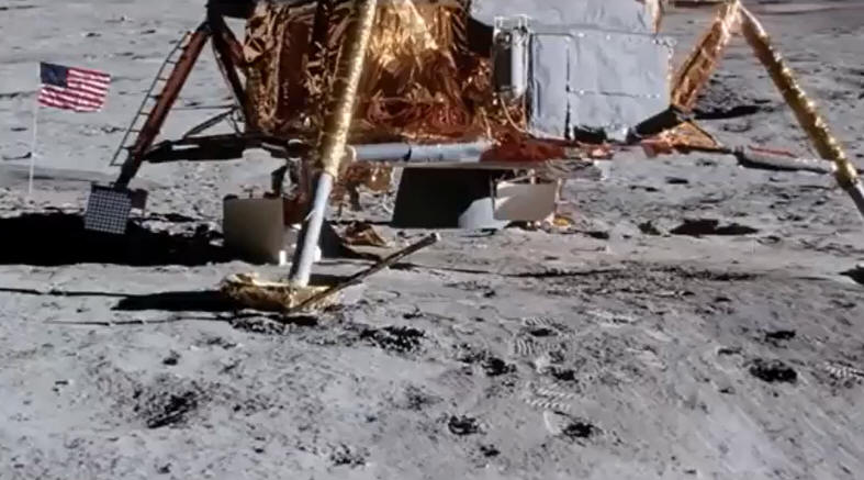 The flag is so small here in this IMAGERY compare to image above on the Apollo movie set where it is HUGE. No moon dust crater created from rocket thrusts when it landed. There never was a visible burning fuel thrust which indicates fakery once again. It's everywhere.